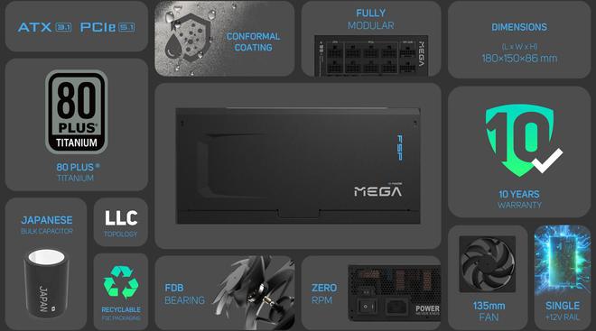 该系列电源的长度被控制在 180mm,低于大多数同功率等级产品。全汉 MEGA TI 内置 135mm 尺寸 FDB 轴承散热风扇,负载低于 40% 时可启动 Zero RPM 零转速模式,还获得了 Cybenetics A++ 噪声等级认证。