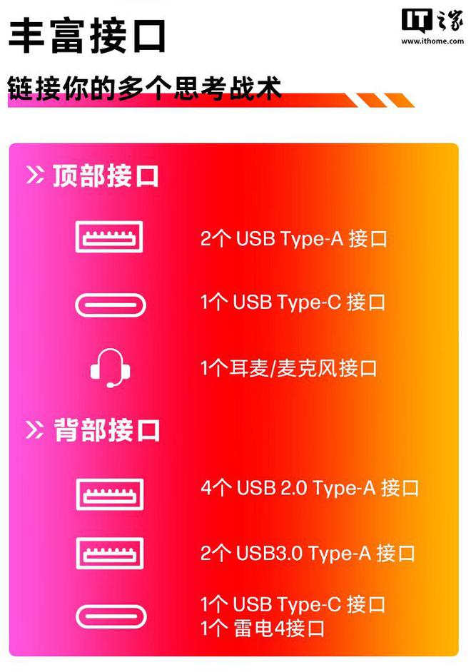 该机支持Wi-Fi 7技术,机箱顶部配备2 个 USB-A接口、1个 USB-C接口、1个3.5mm音频接口;背面配备 4 个 USB-A 2.0接口、2个 USB-A 2.0接口、1个雷电 4 接口、1个 USB-C接口。