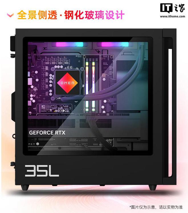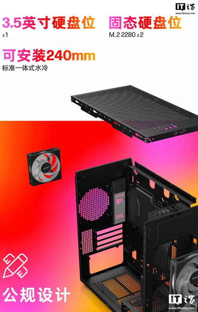 IT之家获悉,该机采用透光钢化玻璃侧透设计机箱,正面可选玻璃面板 / 金属面板,配备ARGB定制灯效。