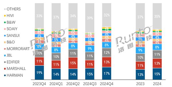 紧随其后的是Marshall,以12.6%的销额份额位居第二,同比增长2.0个百分点,成为市场份额增速最迅猛的品牌。