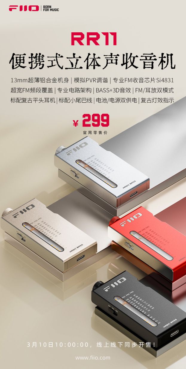 IT之家 3 月 10 日消息,飞傲 RR11 袖珍高音质 FM 收音机今日上市,线上线下同步开售,售价 299 元,券后 289 元。