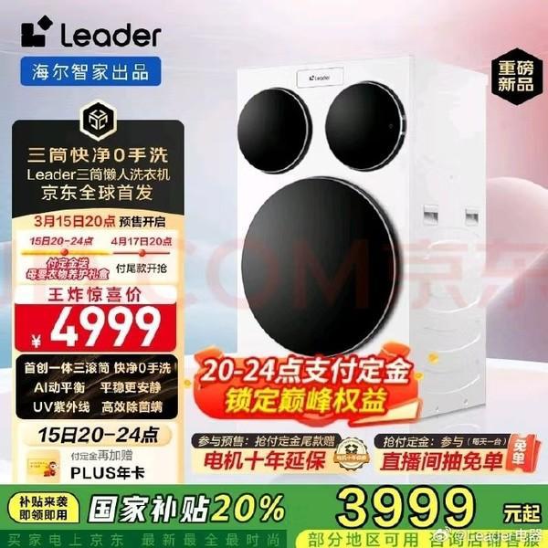 目前,海尔Leader一体三滚筒洗衣机已经开启了预售,售价4999元,叠加国补后到手价仅3999元。