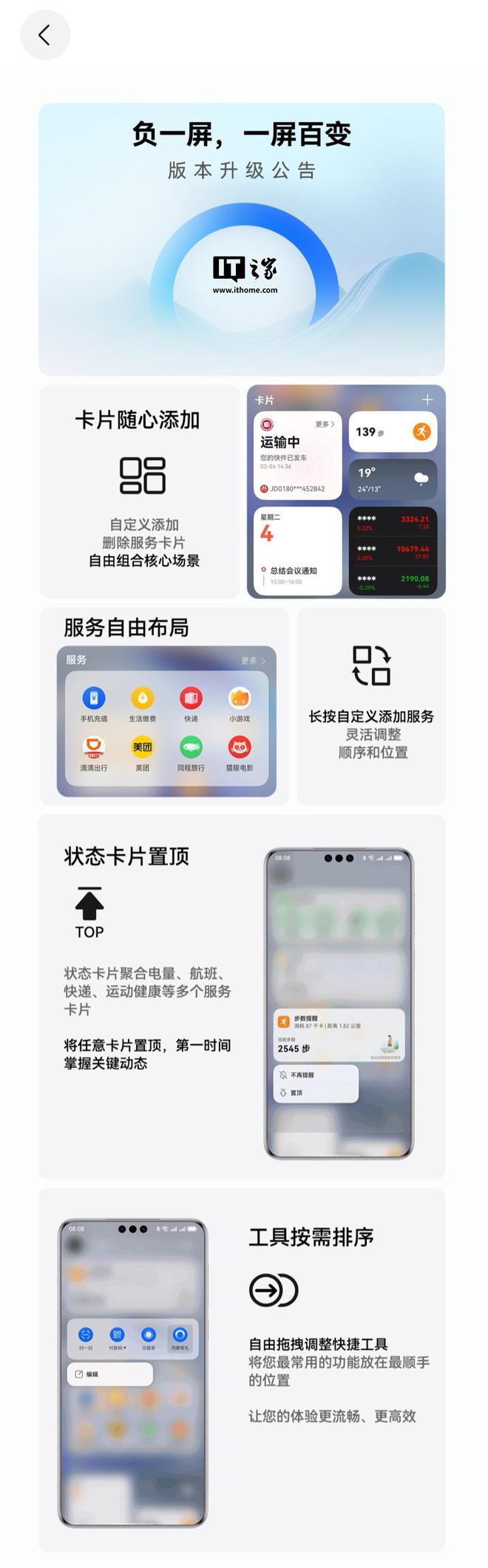 升级至“135”版本的机型已支持新版本“智慧助手・今天”App 的部分功能,包括:卡片添加、服务自由布局、状态卡片置顶、工具按需排序等功能。遗憾的是,目前 12306 尚未完成负一屏的接入(该功能已做预告,预计后续版本支持),暂时仅支持绑定航旅纵横。