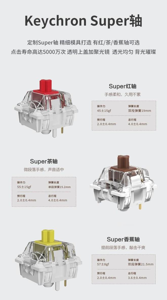 KeychronK4 Max 可选 Super 红、茶、香蕉三种轴体,每种轴均拥有 5000 万次点击寿命,采用透明上盖搭配聚光镜的光效结构。其原装键帽为 OSA 高度双色注塑 PBT 球帽,主体为灰色,左上角 ESC 键键帽为橙色。