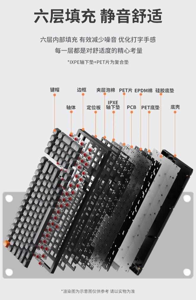 这款键盘内置六层填充结构,可有效减少击键噪音,优化打字手感;底部则是支持 3.5° / 7° / 10° 三种角度调节的两段式脚撑;其支持自研网页驱动。