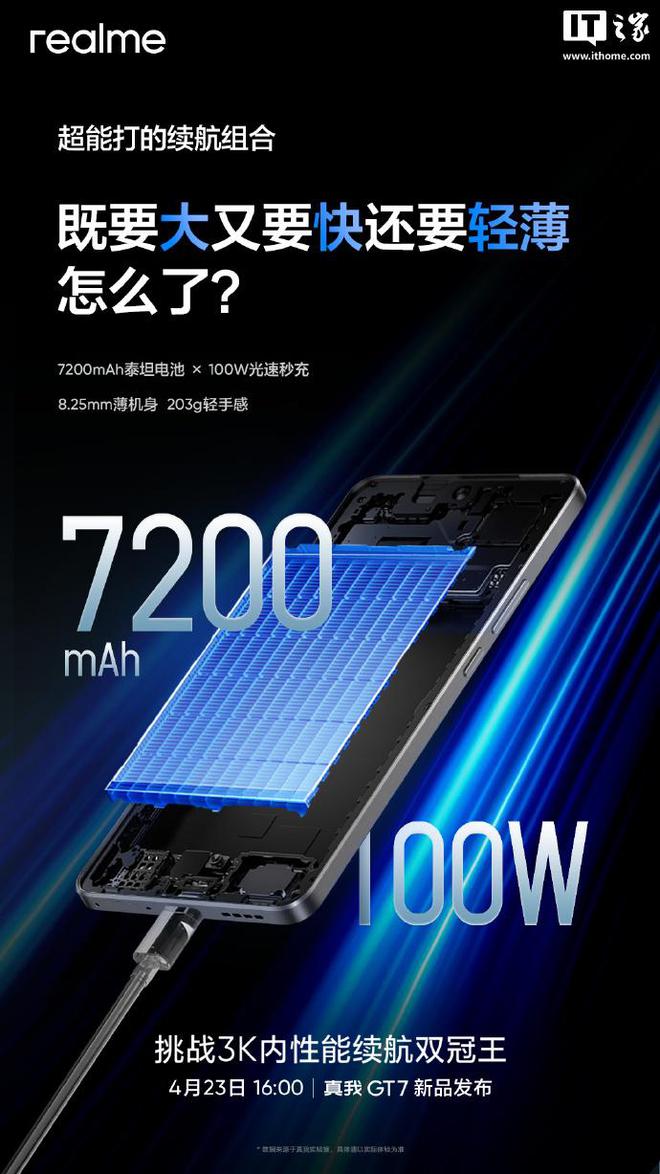 4 月 14 日消息,realme 真我手机官方今日继续对旗下新机真我 GT 7 预热,公布该机配备了 7200mAh 的泰坦电池,并支持 100W 光速秒充技术。