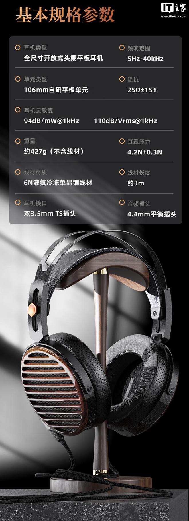 飞傲黄金振膜开放式平板头戴耳机 FT7 今日发售,定价 4999 元,IT之家附参数表: