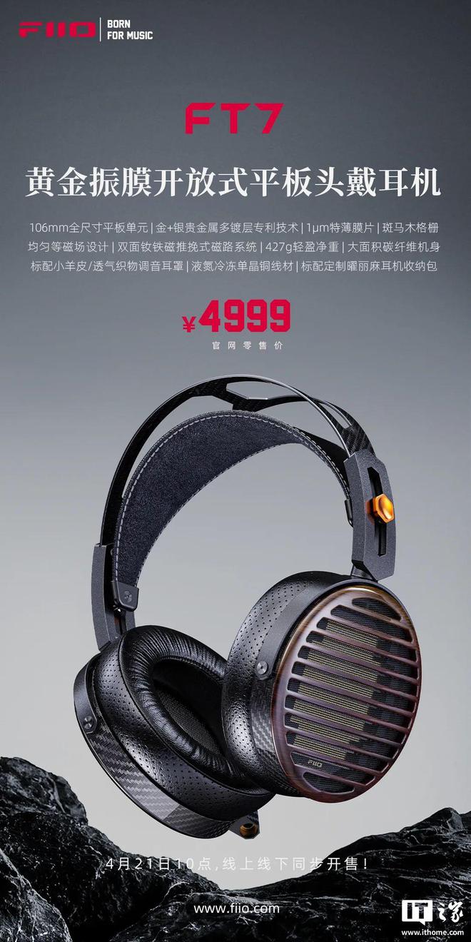 4 月 21 日消息,飞傲黄金振膜开放式平板头戴耳机 FT7 今日发售,定价 4999 元。
