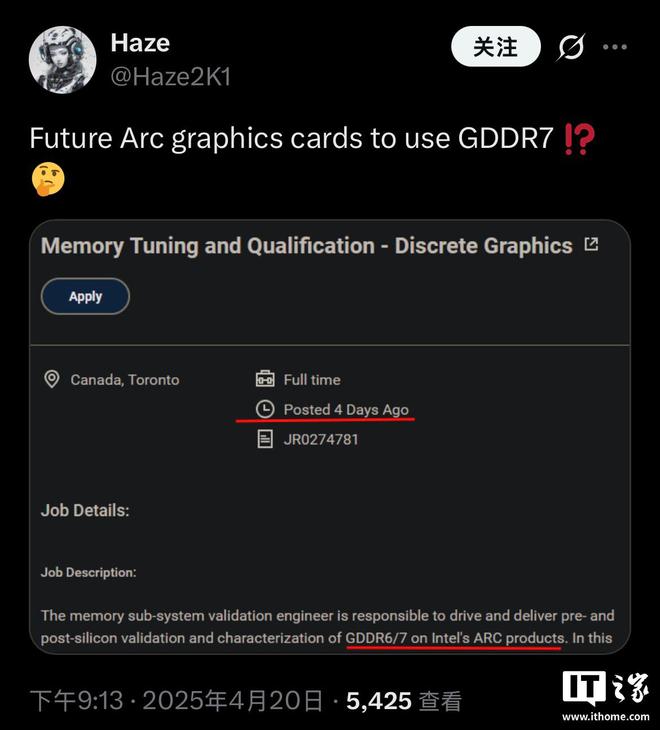 该消息源自 X 平台用户 Haze2K1 推文中的英特尔招聘页面截图,这则于 4 月 16 日发布的招聘信息,在岗位描述中提到“英特尔 Arc 产品的 GDDR6/7 显存”。该推文的一条回帖称 Celestial 显卡将配备 GDDR7 显存,而同时提及的 GDDR6 可能对应 Druid 显卡的配置。