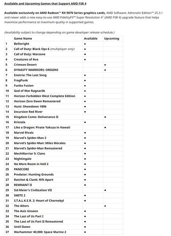 RX 9000系列显卡和FSR 4技术刚刚发布不到2个月,有如此多的游戏支持还是相当不错的。