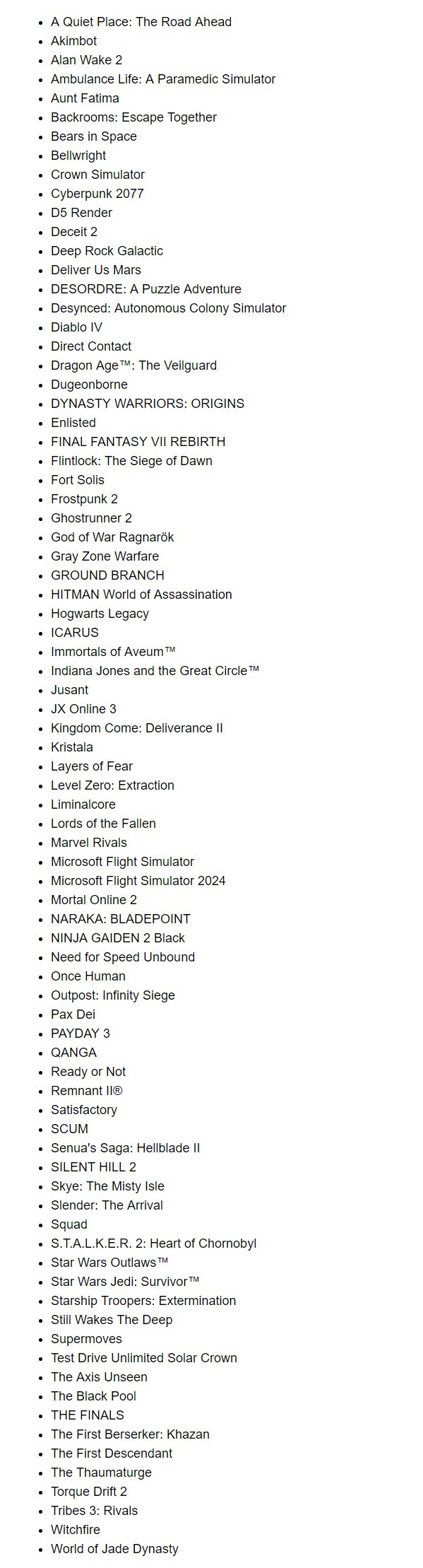 FSR 4游戏中,已发布的有29款,即将推出的有6款,分别是《红色沙漠》《真三国无双:起源》《天国:拯救2》《如龙8外传:夏威夷海盗》《文明7》《多重人生》。
