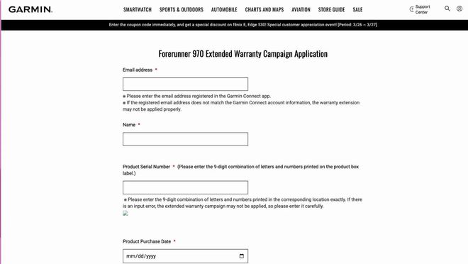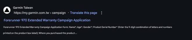 IT之家附上截图如下,在佳明官网上,出现了名为“Forerunner 970 延长保修活动申请”的页面,虽然没有提供关于手表本身的规格和图像信息,但确认了 Forerunner 970 的存在。