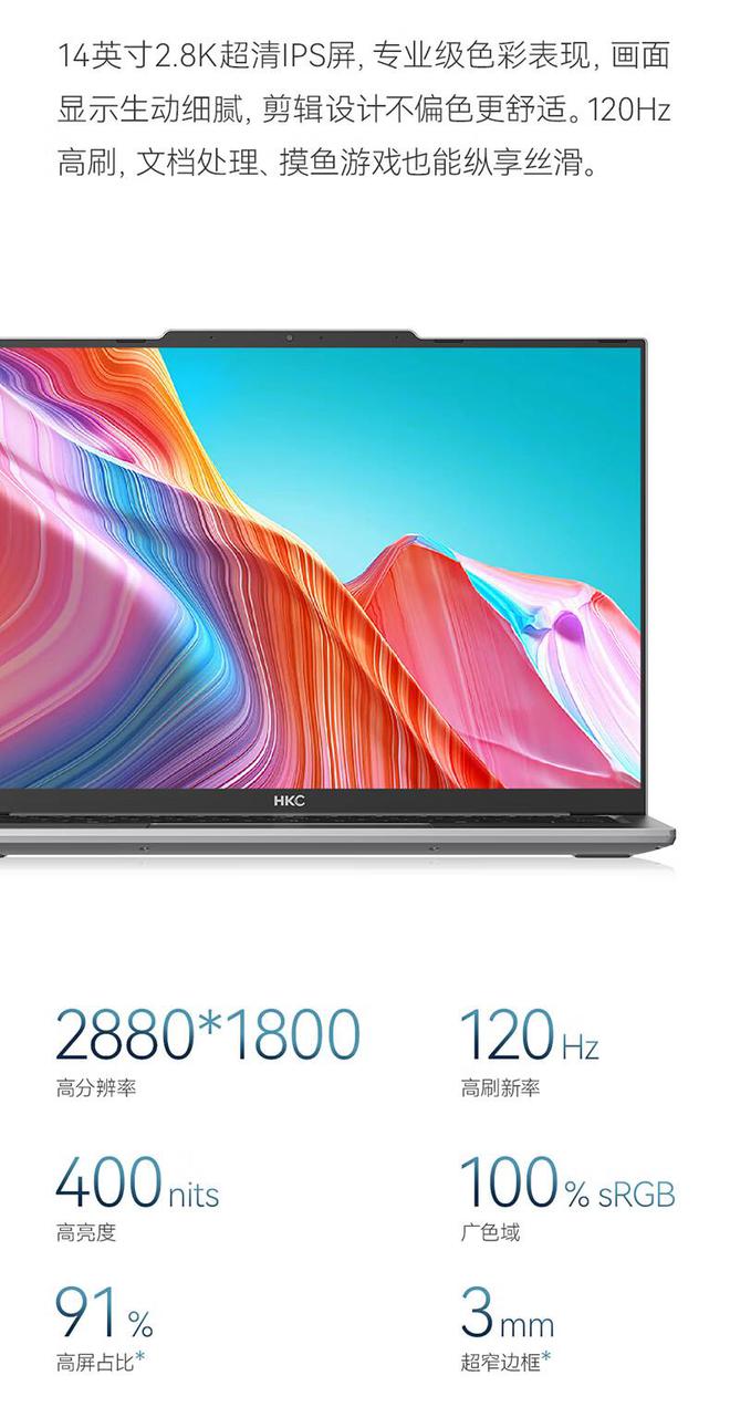 这一轻薄本搭载了一块 14 英寸的 2880×1800 分辨率(16:10 长宽比)120Hz 刷新率显示屏,亮度可达 400 尼特,色域覆盖 100% sRGB,通过 3mm 边框和外凸式摄像头模组实现了 91% 的屏占比。