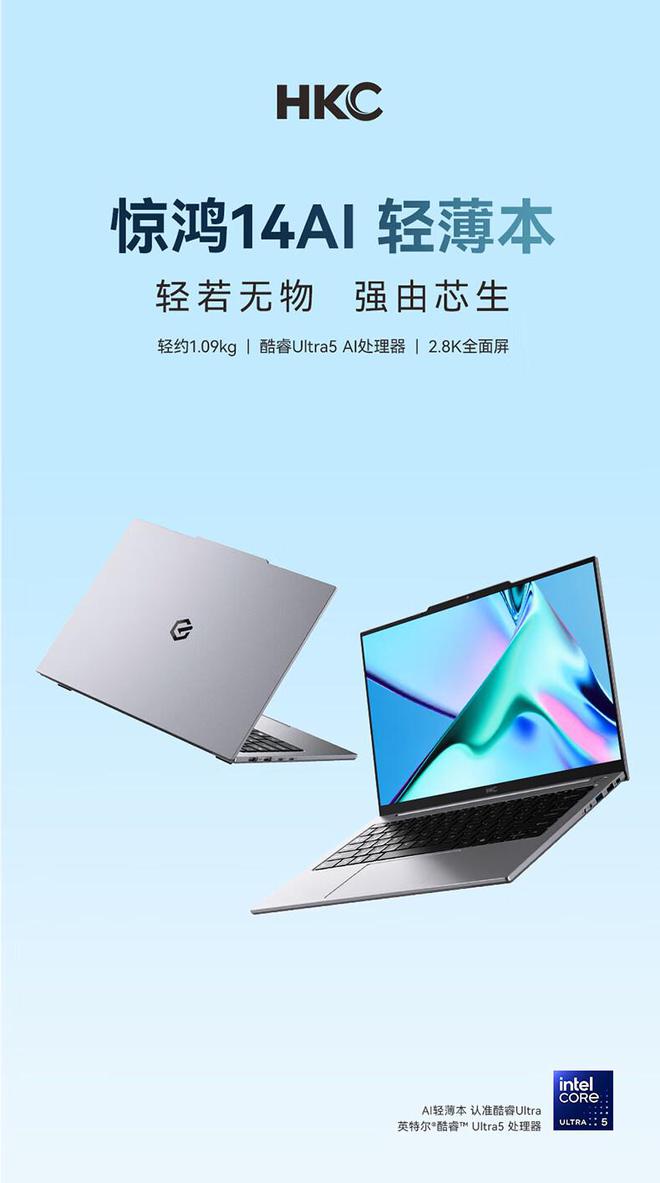 4 月 25 日消息,HKC 惠科今日推出旗下首款全面屏 AI 轻薄笔记本电脑惊鸿 14 AI。该笔记本搭载英特尔酷睿 Ultra 5 125H "Meteor Lake" 处理器,内置 60Wh 电池,整机重量 1.09kg、厚度 15.9mm。