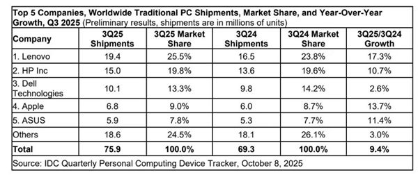 10月9日消息,根据国际数据公司IDC最新数据,2025年第三季度,全球传统个人电脑(包括台式机、笔记本电脑和工作站)出货总量达到7590万台,相较于去年同期(6930万台)增长了9.4%。