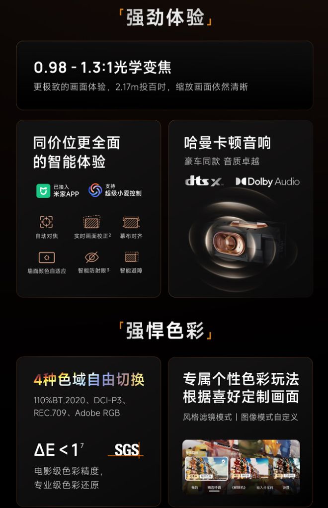 此外,该产品还搭载航天级超精密光学镜片,采用 10 重极致镜片堆叠设计;极米自研人眼仿生调色算法,带来极致色彩表现;同价首配光学变焦,支持 0.98-1.3:1 投射比;豪车同款音响配置,哈曼卡顿原厂音响,专业音质调校。