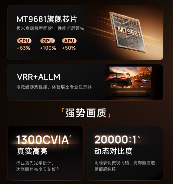 据介绍,这款新品搭载 MT9681 旗舰芯片,支持 VRR 可变刷新率、ALLM 自动低延迟、240FPS 帧率。该产品支持 4K 画质、1300CVIA 亮度,搭载 Qualas32 激光器,动态对比度 20000:1,支持 AI 画质自动调校。