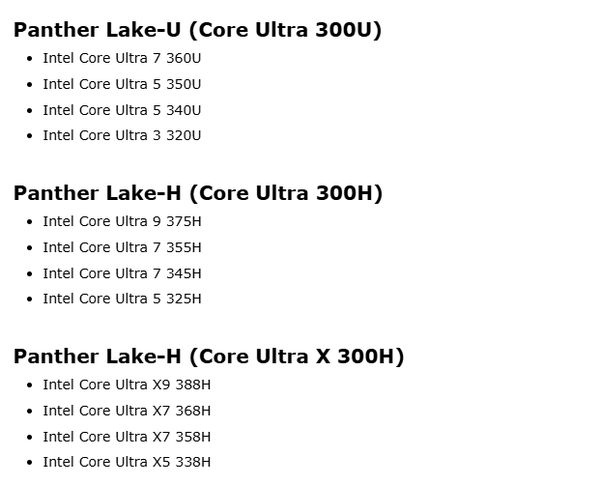 根据HWMonitor披露的信息,Panther Lake将分为三个主要产品层级。定位低功耗设备的Panther Lake-U系列,主要面向轻薄本与超极本,配置4个性能核加4个能效核,配备12MB L3缓存,集成最多4个Xe核心的GPU,并支持最高6400 MT/s的DDR5和LPDDR5X内存。该系列包含Core Ultra 7 360U、Core Ultra 5 350U等四款型号。