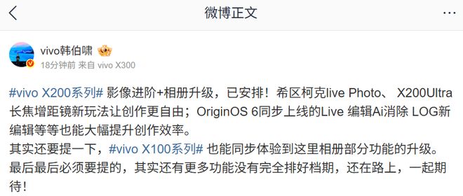 影像功能升级 希区柯克变焦 Live Photo:智能锁定主体,一键完成丝滑变焦(2025 年 11 月陆续推送) 舞台模式双视野录像:一键开启前后置双摄模式,演出现场轻松实现与偶像同框(2025 年 12 月陆续推送) 长焦增距镜支持模式拓展:适配 X200 Ultra,新增支持风光、人像、视频、舞台、抓拍、专业等多种拍摄模式(2026 年 1 月陆续推送)相册功能升级(跟随各机型 OriginOS 6 推送时间同步上线) Live Photo AI 路人消除:支持圈选任意画面中的路人,消除后仍保存为动态照片 Live Photo 编辑:支持 4K 视频转 Livephoto,时长截取、封面效果优化、裁剪、调节等功能,编辑后仍支持 Live 原格式保存 相册编辑体验升级:图片编辑内支持可逆化编辑,支持 LOG 视频色彩还原,变速优化等后期能力升级更多功能升级规划 相册大模型云端增强 AI 旅拍风光人像大师 AI 电影分镜 其他功能后期公布适配机型 vivo X200 vivo X200 Pro mini vivo X200 Pro vivo X200s vivo X200 Ultra