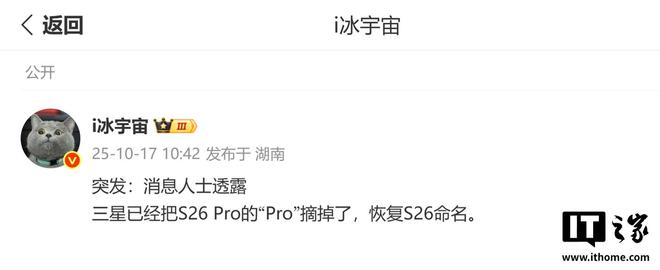 IT之家查询公开资料,消息源 @i冰宇宙 表示:“消息人士透露三星已经把 S26 Pro 的“Pro”摘掉了,恢复 S26 命名。”