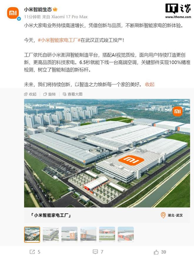 10 月 28 日消息,小米今日官宣,小米智能家电工厂在湖北武汉正式竣工投产。