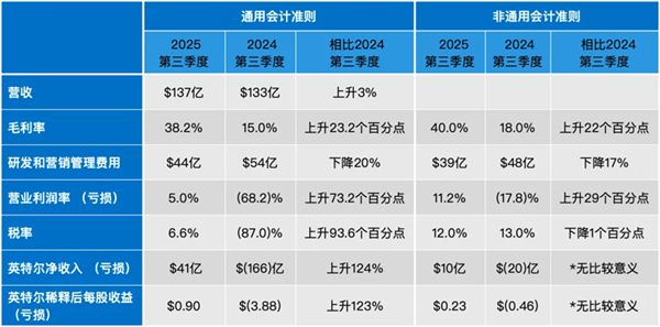 2025年第三季度,Intel取得了137亿美元的总收入,同比增长3%,提升不是很大,但去年同期的亏损166亿美元,如今变成了净赚41亿美元,简直是云泥之别。