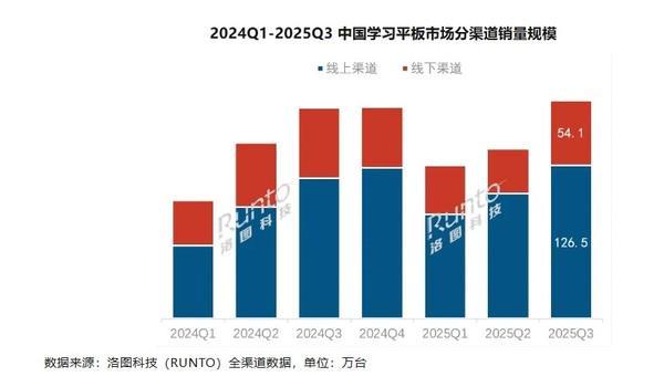 近日,洛图科技(RUNTO)发布《中国学习平板零售市场月度追踪》报告。数据显示,2025年第三季度,中国学习平板市场在线上线下全渠道的销量为180.6万台,同比增长3.5%,销售额为54.3亿元,同比增长7.4%。其中,线上销量为126.5万台,占到整体市场的70.1%。均价维持在3000元左右,市场销量主要集中在2000–2999元,占比高达51.0%。