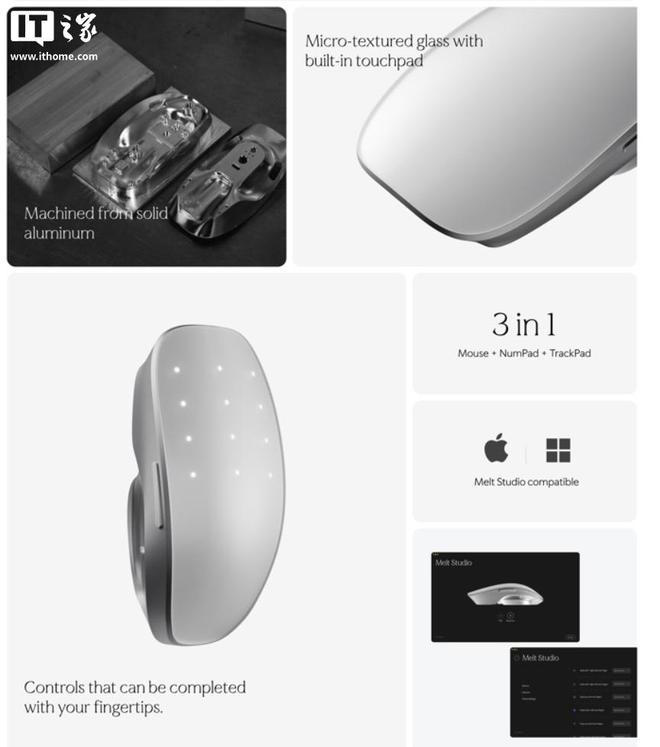 10 月 29 日消息,一款名为 Melt Mouse 的多功能鼠标现已现身 Kickstarter 众筹平台,采用极简设计风格,集成鼠标、触控板、数字键盘,外观设计与苹果的妙控鼠标有几分相似。