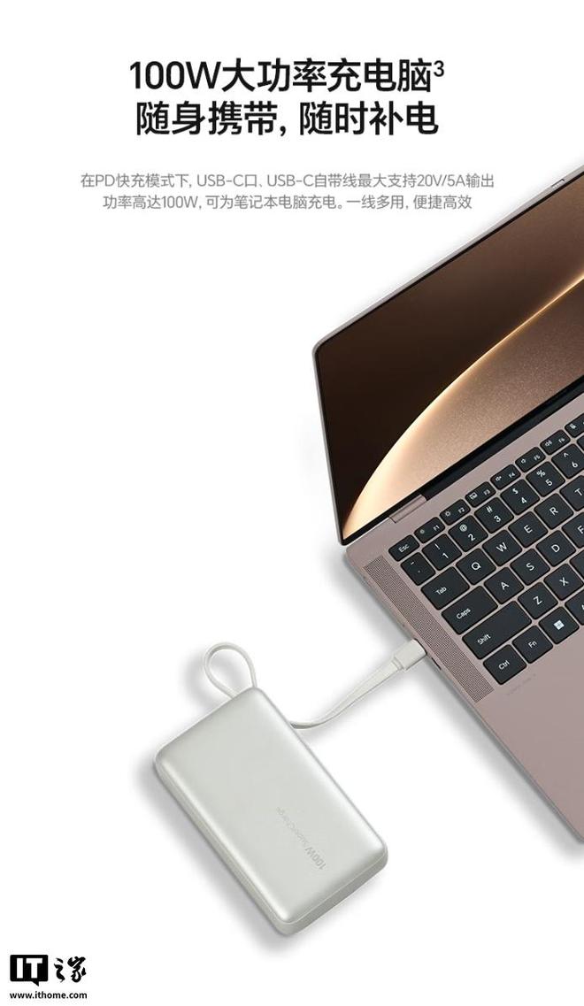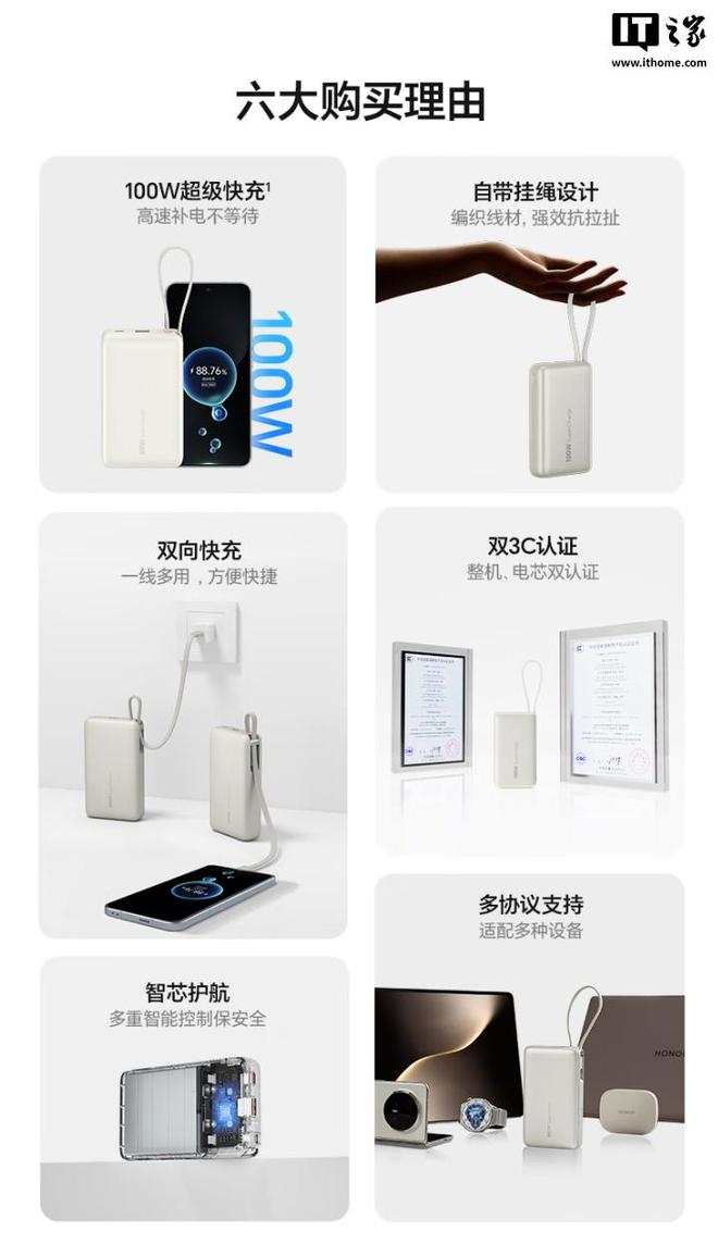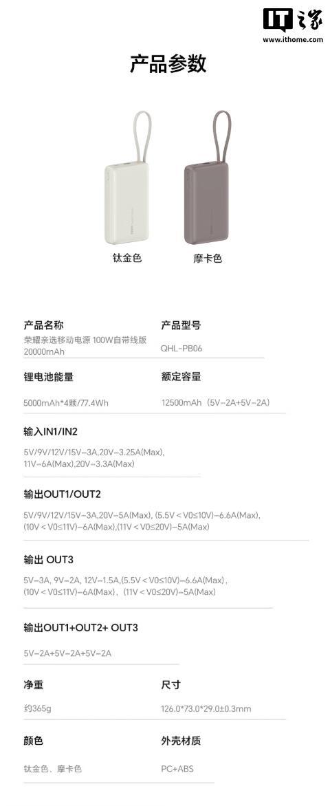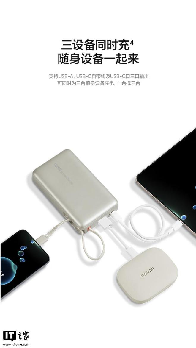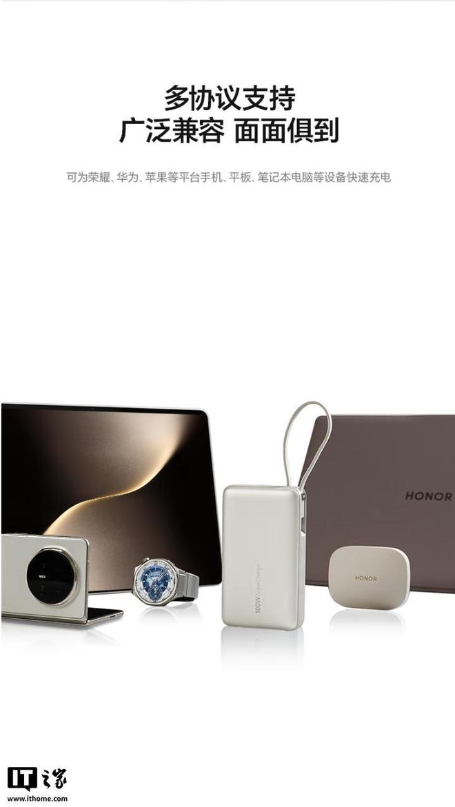 11 月 3 日消息,荣耀亲选移动电源 100W 自带线版现已开售,容量达 20000mAh,支持 SCP、PD 双模式 100W 快充,采用自带挂绳设计,通过双 3C 认证,可带上飞机。