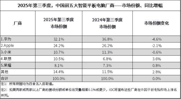 2025年第三季度中国平板电脑市场出货量排名前五厂商市场表现如下: