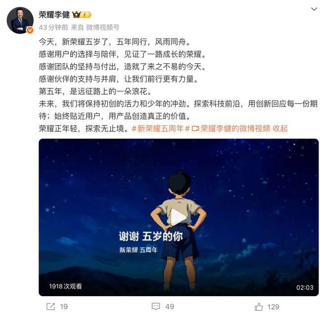 2025年11月17日,荣耀CEO李健在社交媒体平台发文庆祝新荣耀成立五周年。