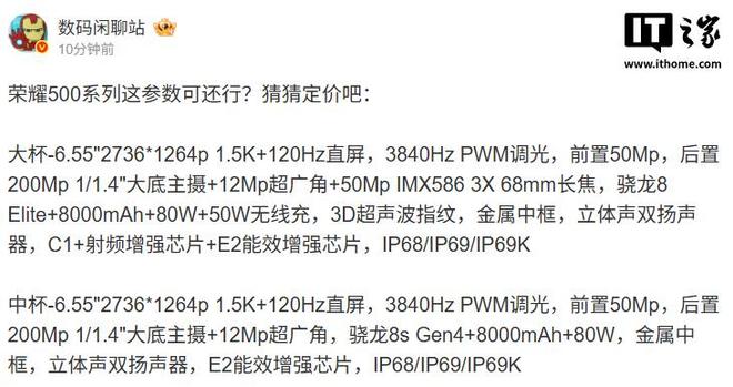 11 月 17 日消息,今日早些时候,荣耀 500 系列新品发布会官宣定档 11 月 24 日 19:30,代言人为肖战。博主 @数码闲聊站 现已曝光两款新机的主要参数。