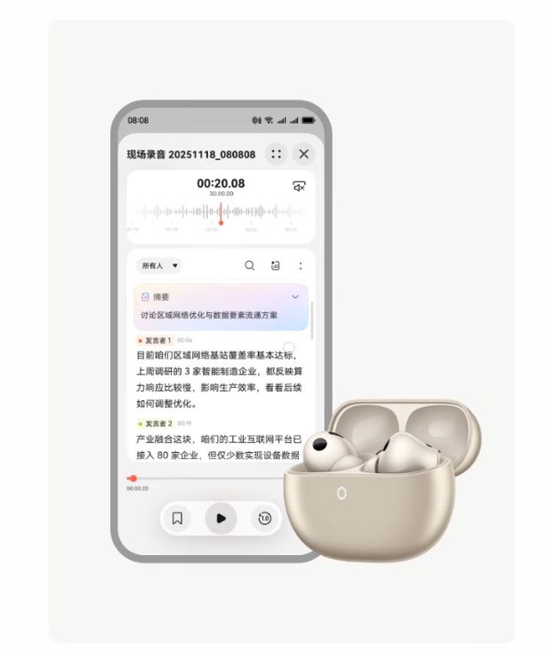 华为首款支持多场景录音的耳机,最长支持 200 分钟录音时长。无论是线上会议、语音通话,或线下会议、讲座、采访,耳机都能让你专注当下,随时随地便捷记录谈话内容。配合搭载 HarmonyOS 6 的手机使用时,录音机 App 还支持实时转写和生成摘要等功能。
