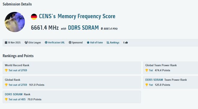 11 月 19 日消息,科技媒体 Wccftech 昨日(11 月 18 日)发布博文,报道称 DDR5 内存超频世界纪录再次被刷新,德国超跑专家 CENS 创造了 13322 MT/s,相比较此前纪录(13211 MT/s)超出 111 MT/s。
