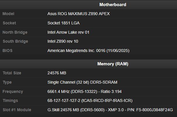 大多数世界纪录都是使用技嘉 Z890 AORUS Tachyon ICE 主板创造的,但 Z890 APEX 也毫不逊色。这款主板帮助 CENS 实现了惊人的 6661.4 MHz 或 13322.8 MT/s 的内存频率,速度提升了近 111 MHz 。