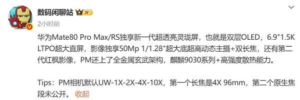 11月24日,知名数码博主数码闲聊站爆料了华为Mate80系列的最新消息,明天就是发布会了,该爆料的可信度也接近100%。如果大家对华为Mate80 Pro Max和Mate80 RS非凡大师感兴趣,不妨提前了解一下此次爆料细节。