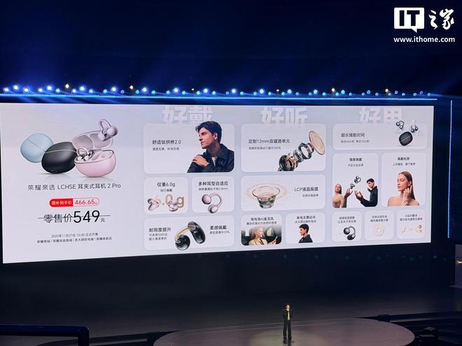 11 月 24 日消息,荣耀亲选 LCHSE 耳夹式耳机 2 Pro 今晚正式发布,耳机搭载定制 12mm 双磁路单元、骨传导 AI 麦克风,零售价 549 元、国补到手价 466.65 元(11 月 27 日 10:00 开售)。
