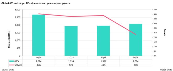 IT之家援引博文介绍,中国市场的放缓也直接冲击了大尺寸电视的增长。80 英寸及以上电视的季度增速已从去年的超过 40% 骤降至 23.1%,70-79 英寸品类的增速也冷却至 1.1%。