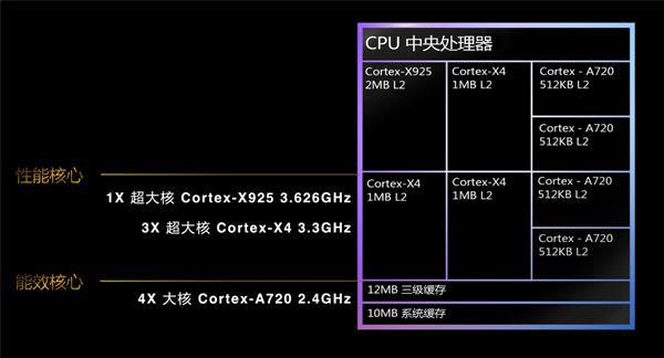 CPU架构则坚持“全大核”设计,以榜单主力型号为例,其采用1×3.25GHz Cortex-A725超大核+3×3.0GHz Cortex-A725大核+4×2.1GHz Cortex-A725大核的八核配置,无小核拖累性能的短板,多核运算效率显著提升。
