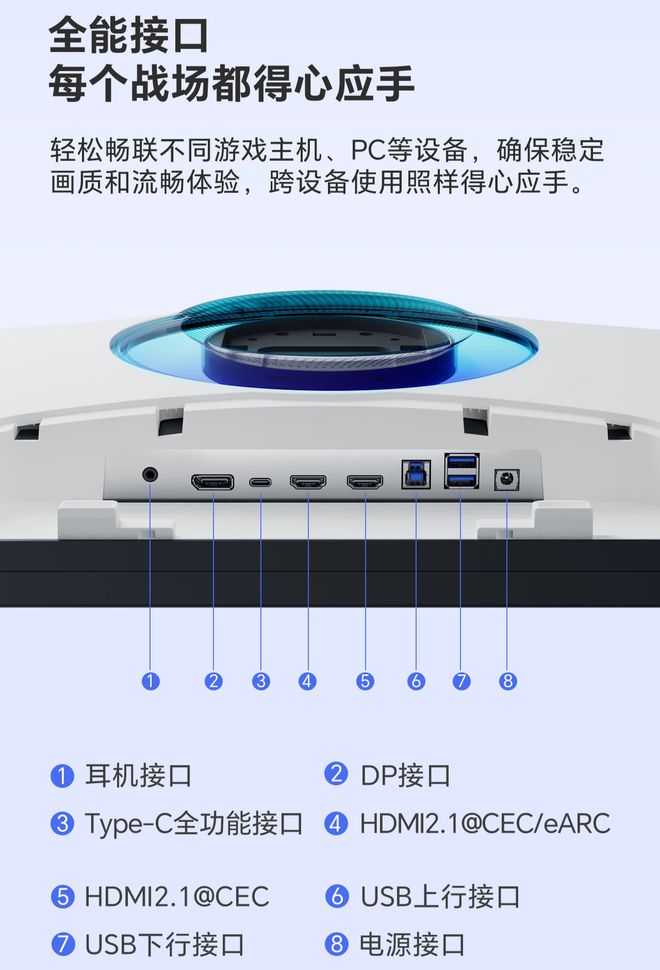 接口方面,海信 27GX 显示器拥有全能接口,包括:耳机接口、DP 接口、Type-C 全功能接口、HDMI 2.1 @CEC/eARC、HDMI 2.1 @CEC、USB 上行接口、USB下行接口和电源接口。