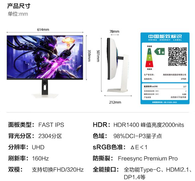 显示器搭载行业首发的黑曜屏技术,配备双层纳米级 LR 低反膜,黑度提升 33%。内置 2304 分区 U+ Mini LED 灯珠,支持 AM 驱动逐点调光,覆盖 98% DCI-P3 色域和 85% BT.2020 色域,ΔE<1。
