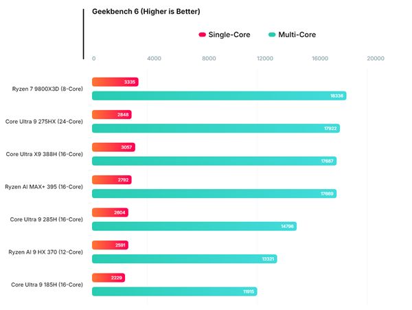 作为对比,在单核测试中,酷睿Ultra X9 388H的得分比其前代Ultra 9 285H提升了近15%,与AMD的旗舰级移动芯片锐龙AI Max+ 395相当。