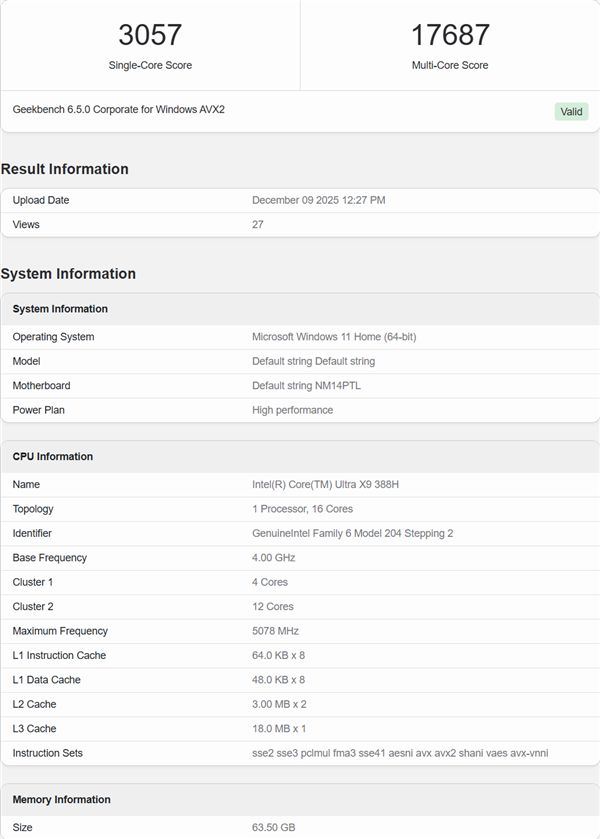 测试结果显示,Intel酷睿Ultra X9 388H处理器在Geekbench测试中,单核得分3057分,多核得分则为17687分。