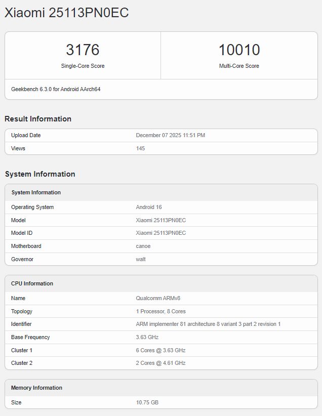 一款型号为25113PN0EC的小米手机,出现在了Geekbench跑分平台,这款手机被认为是小米 17国际版。根据跑分信息显示,该机采用Android 16系统,配备了12GBRAM内存,搭载第五代骁龙8至尊版处理器,单核跑分为3176分,多核跑分为10010分。