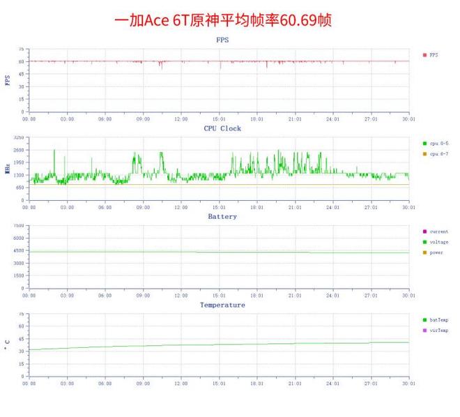 《原神》40分钟跑图打怪测试中,一加Ace 6T平均帧率60.69帧,1% LOW帧56.4帧。正面温度40.5℃,背面40.8℃,手感仅温热。