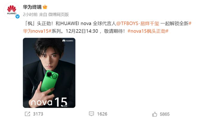 官宣新机后,华为官方还发了nova全球代言人易烊千玺手持nova 15 Ultra的宣传海报,该机型外观首次亮相。