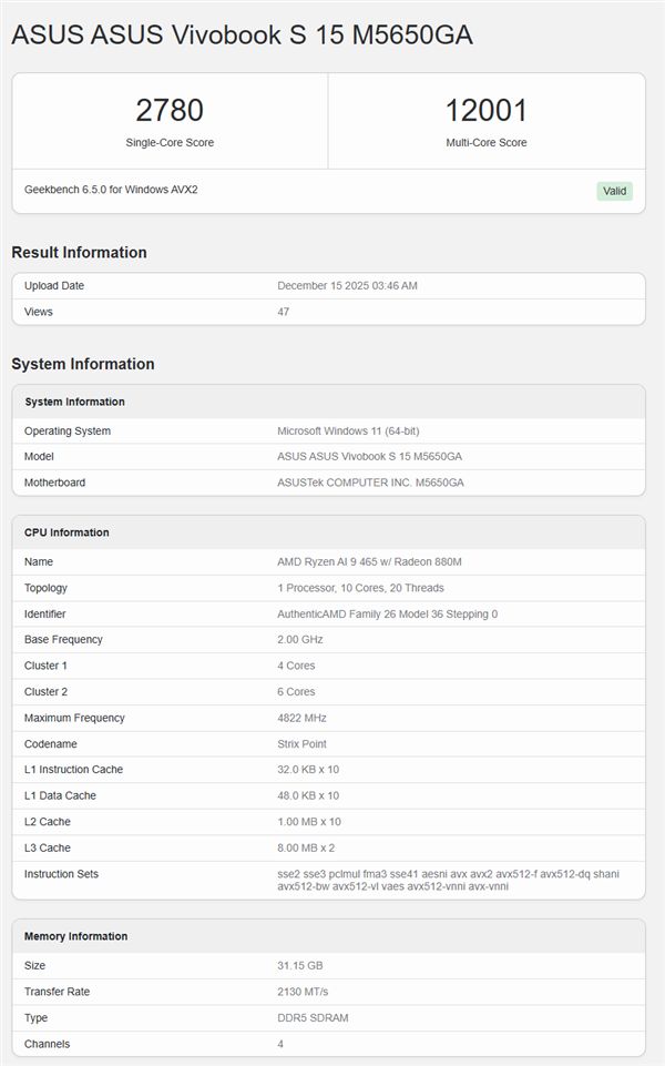 根据测试数据,锐龙AI 9 465在Geekbench 6中取得了单核2780分、多核12001分的成绩,这一表现与现有的锐龙AI 9 365(Strix Point)基本处于同一水平。