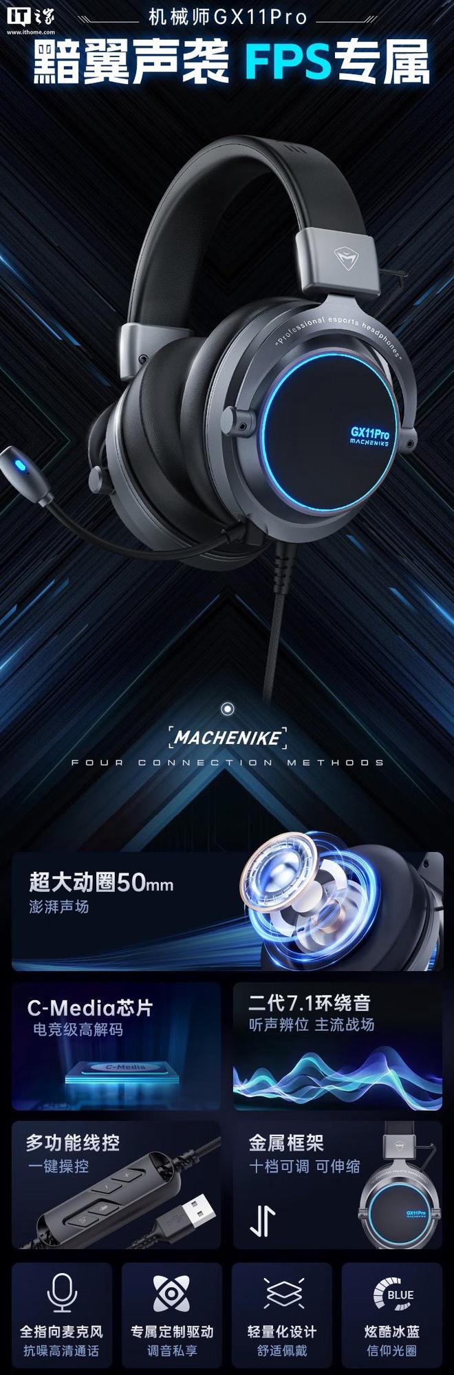 该耳机匹配 50mm 动圈单元,支持第二代虚拟 7.1 声道环绕音,IT之家附产品参数如下: