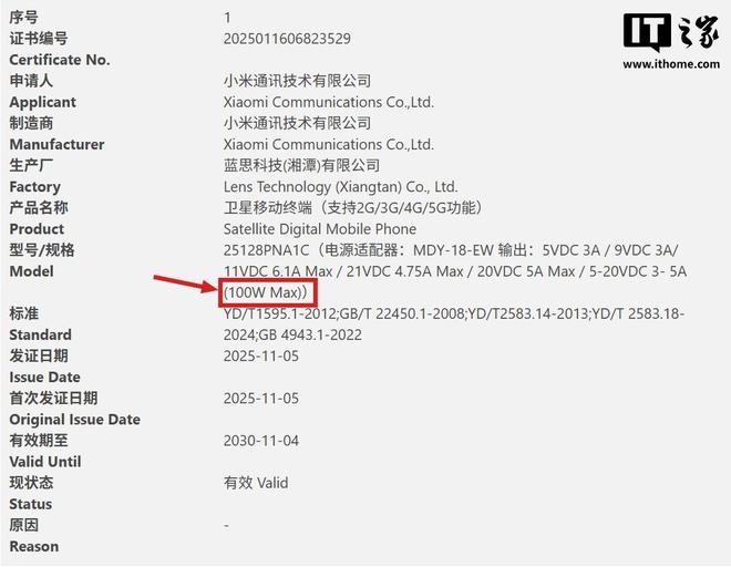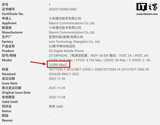 该机型的国行版本(型号 2512BPNDAC)也已早先一步获得了国内 3C 认证,显示支持 100W 有线快充。