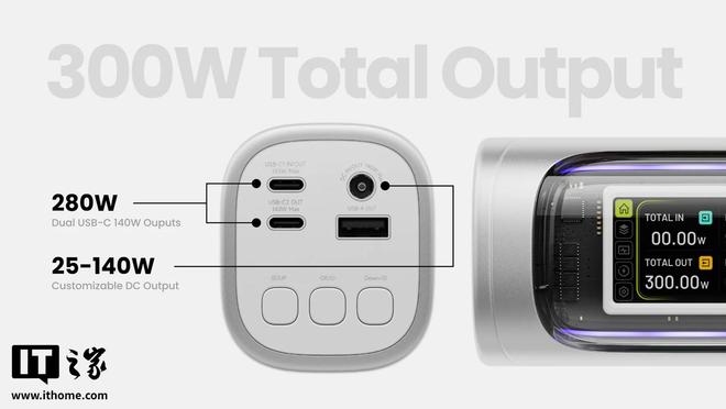据介绍,这款充电宝配备两个 Type-C 接口、一个 DC 接口和一个 USB-A 接口,其中 Type-C 接口双口最高输出功率可达 280W(IT之家注:140W+140W),支持 PD 3.1 快充协议,而 DC 接口的最高输出也是 140W,兼容笔记本、游戏机、手机、无人机、显示器、相机、电烙铁、路由器、蓝牙音箱等设备。